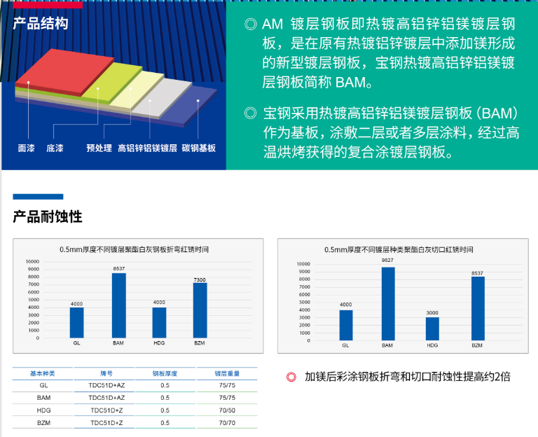 AM coated steel plate, also known as high aluminum zinc aluminum magnesium coated steel plate, is a new type of coated steel plate formed by adding magnesium to the original hot dip aluminum zinc coating. It uses hot dip high aluminum zinc aluminum magnesium steel plate as the substrate, coated with two or multiple layers of paint, and obtained through high-temperature baking as a composite coated color coated steel plate.