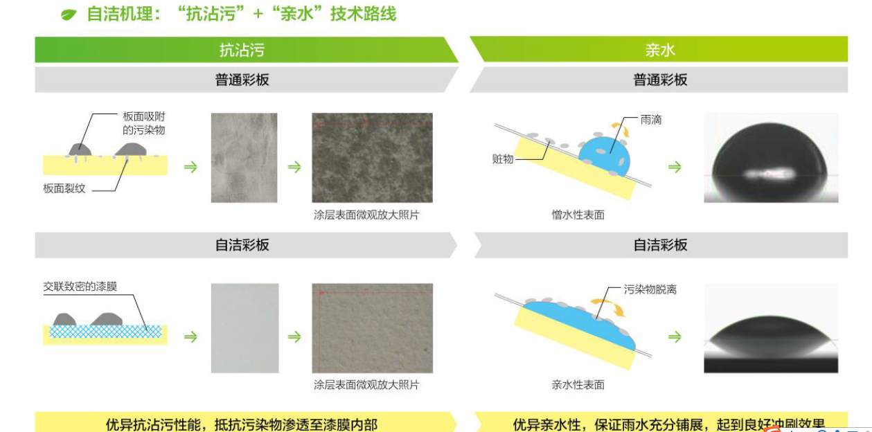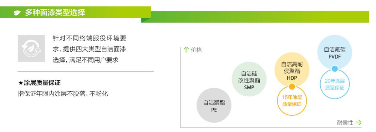 Excellent anti fouling performance, able to resist pollutants penetrating into the paint film. The excellent hydrophilicity ensures that rainwater fully spreads on the surface of the coating, providing a good flushing effect. For building materials in areas with high pollution and dust, it is a self cleaning color coated steel plate with a special "hydrophilic+anti stain" topcoat structure design. In addition to excellent high decoration and outdoor durability, it does not require manual cleaning and maintenance. With the help of rainwater washing, it can maintain a long-lasting cleanliness of roofs and walls in industrial and urban areas with poor air quality.