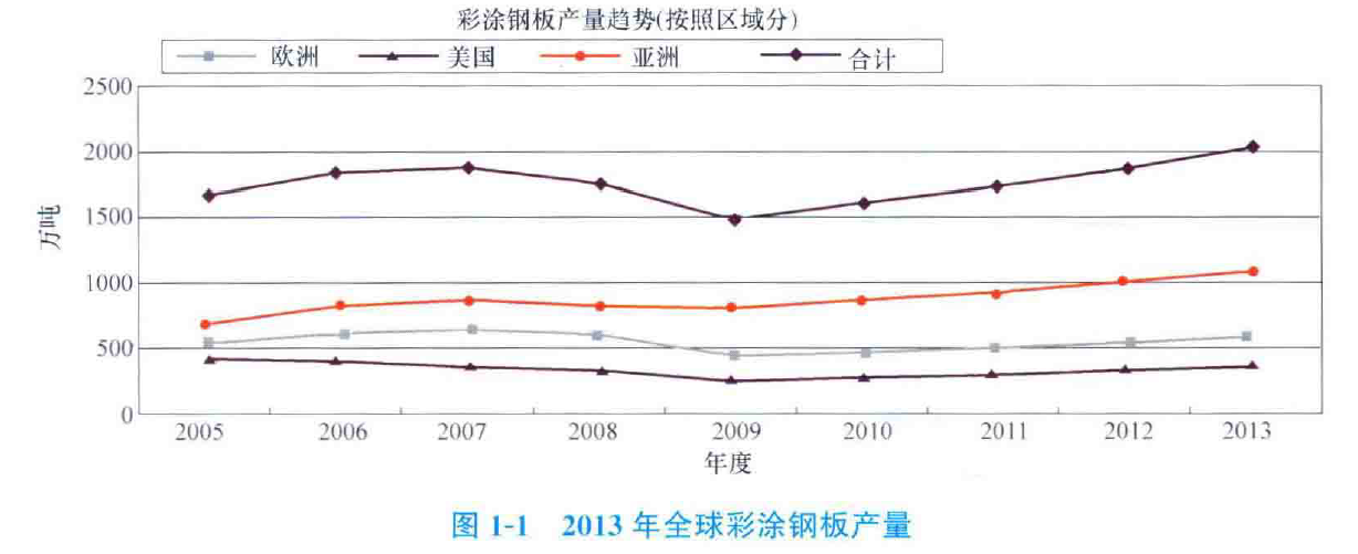 根據日本相關公司的統(tǒng)計. 2013 年全球彩涂鋼板產批約 2000 萬噸(圖 1) ,其中歐洲年產量約500 萬噸 美國約 400 萬噸, 亞洲約1100 萬噸。根據歐洲卷材協(xié)會 ( ECCA ) 、美閏卷材協(xié)會 ( NCCA )統(tǒng)計顯示: 2016 年歐洲(不含俄羅斯)彩涂鋼板年產量約 500 萬噸,美國約 400 萬噸。處于平穩(wěn)發(fā)展期。近年俄羅斯新建彩涂機組較多,呈現(xiàn)上升趨勢, 年產址約 70 萬噸。