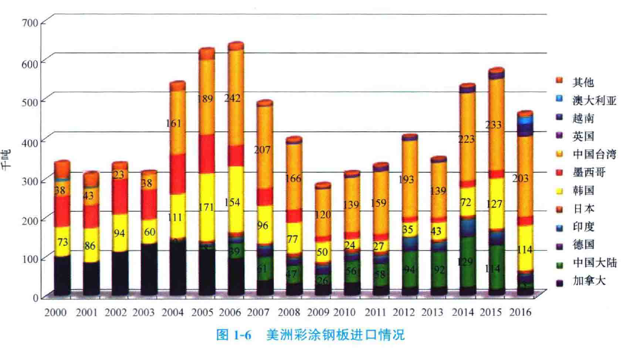 近年來.亞洲彩涂鋼板產顯總體呈上升趨勢。其中國大陸上升趨勢明顯,印度次之。2013 年中國大陸彩涂鋼板產量超過 500 萬噸。由于亞洲產能的迅速增加, 使大量產品流向歐美,影響了全球的彩涂鋼板產品市場,2016 年歐洲進口彩涂鋼板約 73 萬噸,主要來自韓國和印度;2016 年美國進口彩涂約46萬噸,主要來自中國臺灣和韓國。