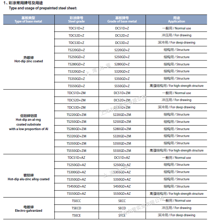 2,寶鋼彩涂產(chǎn)品常用的彩涂基板的牌號及用途一覽: