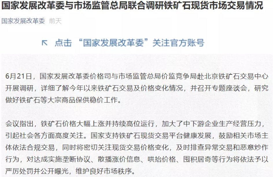近日,國家發(fā)展改革價格司與市場監(jiān)管局價監(jiān)競爭局赴北京鐵礦石交易中心開展調研,詳細了解今年以來鐵礦石交易及價格情況,并召開專題座談會,研究做好鐵礦石等大宗商品保供穩(wěn)價工作,在黑色系產品價格相對弱勢下行的趨勢中,鐵礦石價格仍不斷小幅上調并保持高位運行,鋼市原料成本承壓嚴重,極大的壓縮了鋼鐵行業(yè)利潤,國家對此不斷出臺相關政策,采取穩(wěn)價措施,此次調研工作再次體現國家調控的力度,重申做好大宗商品的穩(wěn)價工作,為鐵礦石的價格變化奠定了下行的基調。